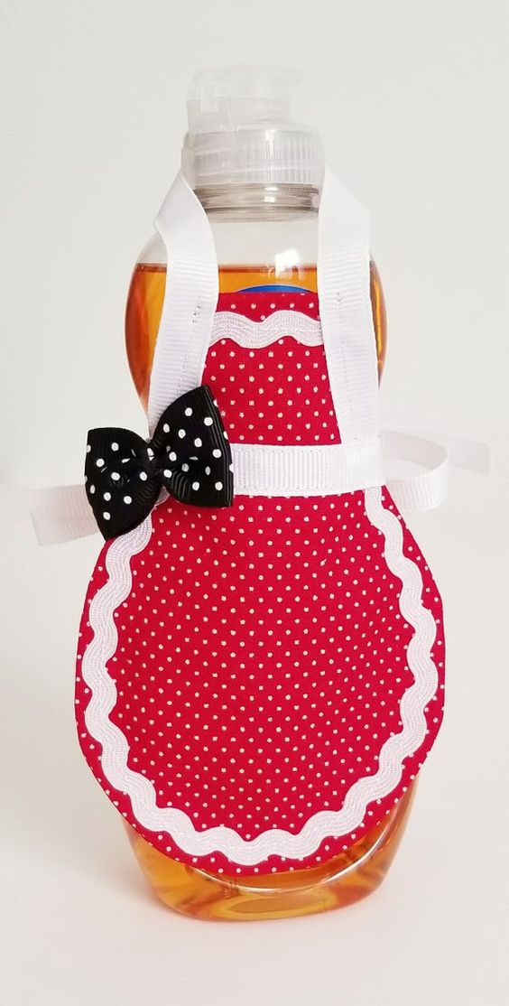 Para uma decoração perfeita cada detalhe é essencial, portanto, peças graciosas vão alegrar sua cozinha e sua família. Com estas peças você deixará sua cozinha decorada e alegre. Você vai dar um charme a mais em almoços, festas e jantares em família. Estes aventais protegem os vidros da entrada de formigas ou insetos, além disso, evita que seus convidados sujem as mãos em caso de escorrimento. Como as peças são pequenas, então borde flores ou frutas para decorar estes aventais. Veja aqui um tutorial de como confeccionar um avental simples para vidro de detergente.