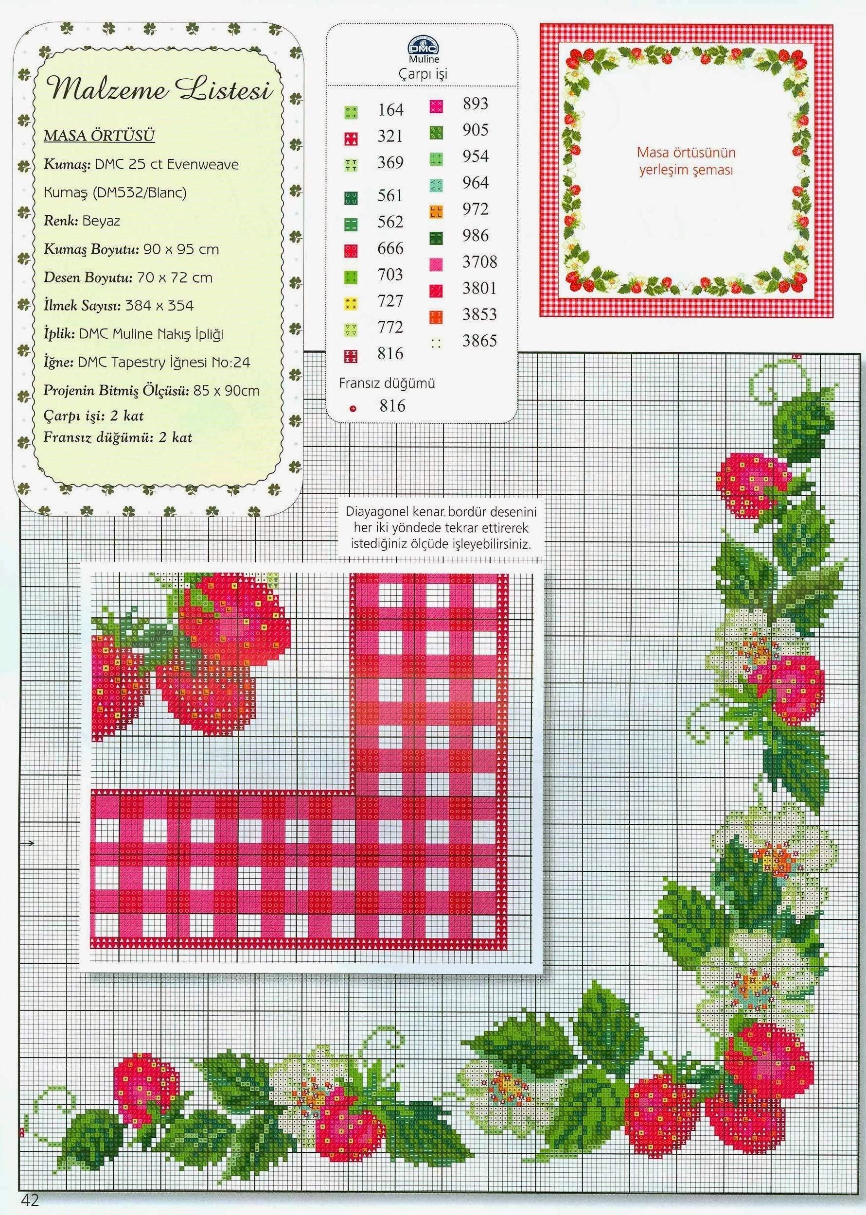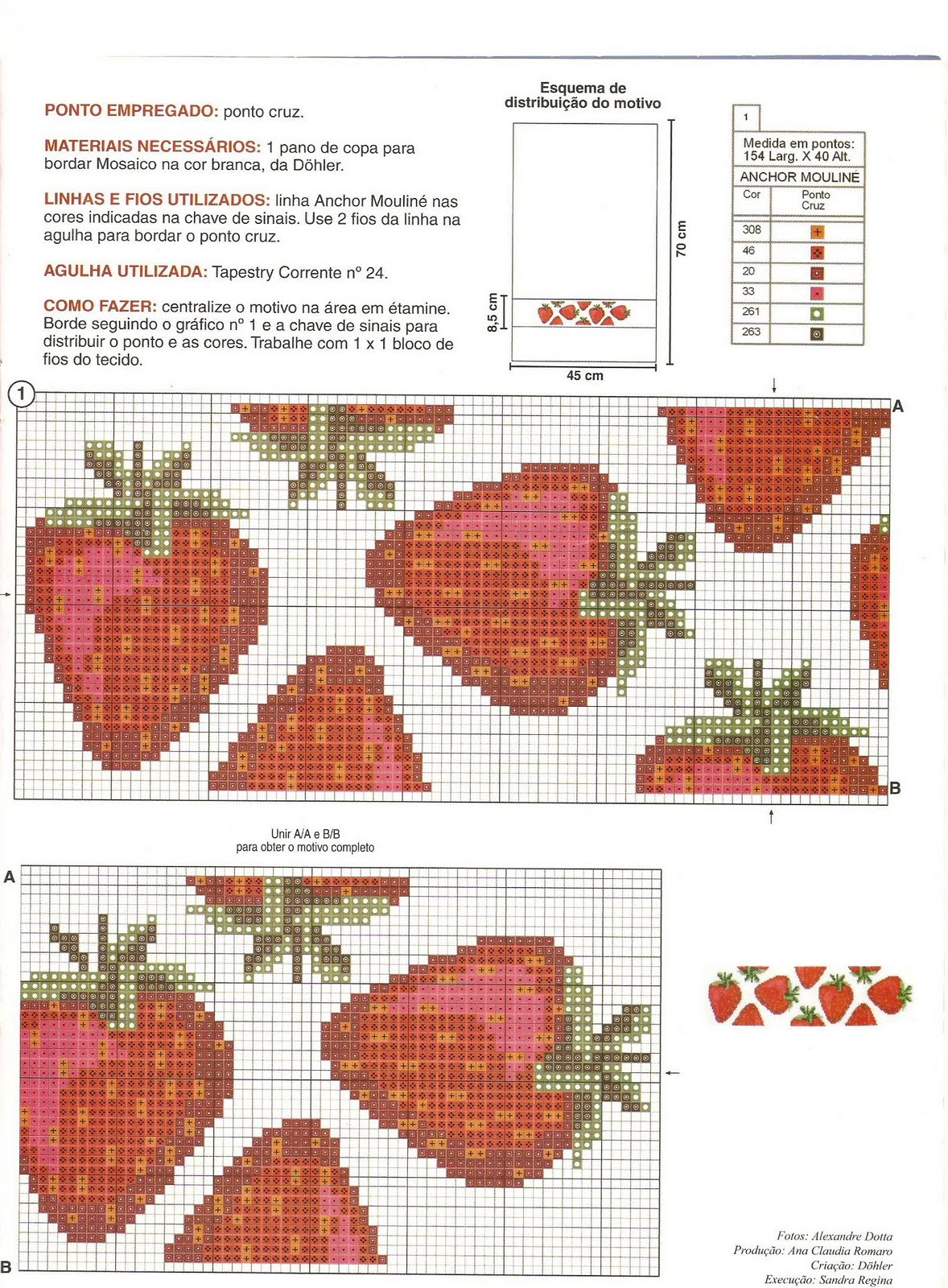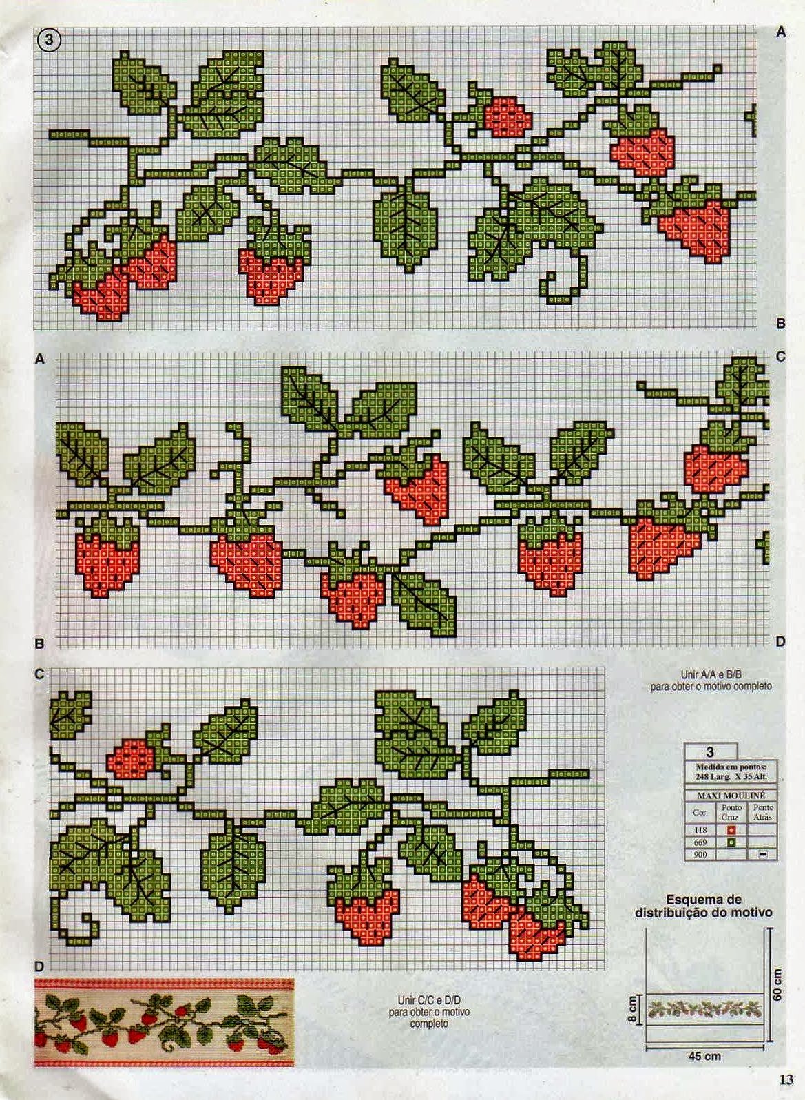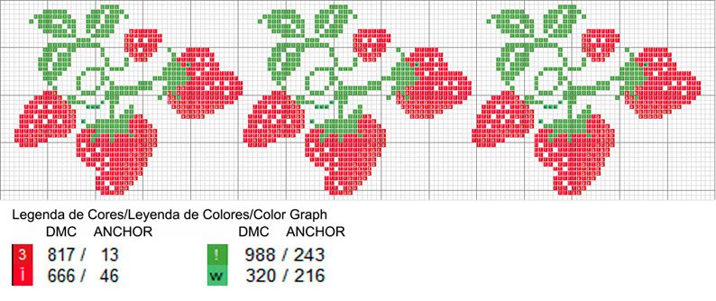 Vejam os gráficos abaixo e como foram bordados. Uma guirlanda linda de morangos em almofadas. Gnomos ou duendes de roupinhas de morango em quadros na parede e barrado de moranguinhos na cortina da cozinha. Tem também barrados de morangos para toalhas de mesa ou cortinas. Sua cozinha ficará linda com esses bordados de ponto cruz!